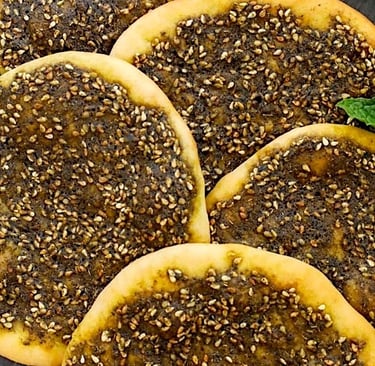 powder, and sesame seeds (occasionally) served with taratour (tahini) sauce, and a piece of Lebanese bread.
